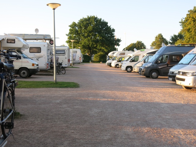 På Läckö camping fick vi den sista lediga platsen. Att den var ledig berodde nog på att de stora plastschabraken inte kom på plats här. Men en liten smidig plåtis gick att knixa in utan större besvär. Less is more!
